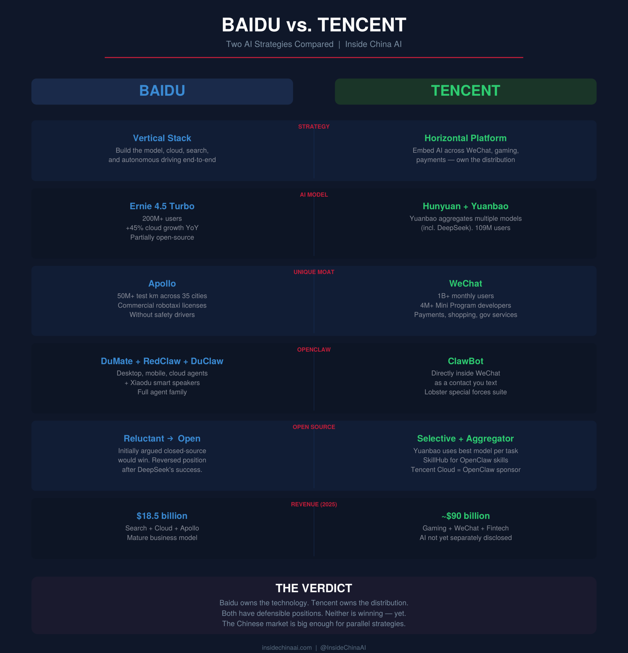 By model quality: Neither leads — both trail Alibaba’s Qwen and DeepSeek in open-source adoption and benchmark results. Baidu has a stronger standalone model; Tencent has a smarter distribution strategy.